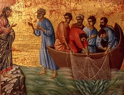 Op deze tweede zondag na Pasen luisteren we naar het verhaal van de vangst van 153 vissen. Op zijn schilderij heeft Reilly heel beeldend laten zien hoe die visvangst de discipelen met de Heer verbindt. Dat alles rond de zon die opkomt.