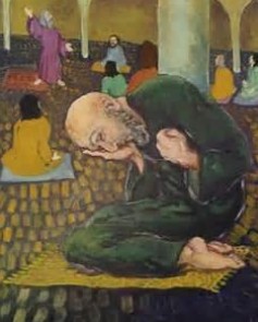 Deze zondag luisteren we naar een volgende gelijkenis uit het evangelie van Lucas. In deze gelijkenis ‘zien’ we twee mensen bidden bij de tempel: een Farizeeër en een tollenaar. De kunstenaar Christian Dare laat dit verhaal afspelen in een omgeving die op een moskee lijkt: een aantal mensen zit op gebedsmatten. Eén ervan is opgestaan en spreekt met grote gebaren. Op de voorgrond is een andere man prominent in beeld. Hij zit voorovergebogen op zijn knieën. Hij zit ineengedoken en uit zijn houding spreekt treurigheid en verdriet. Opvallend is hoe de mensen op de gebedsmatten hun aandacht richten op de man die is opgestaan. Terwijl de kunstenaar onze ogen vooral richt op de man op de voorgrond. Wie zien wij en wat zien wij in het licht van de woorden van het evangelie? Hoe kijken wij naar onszelf en naar elkaar?